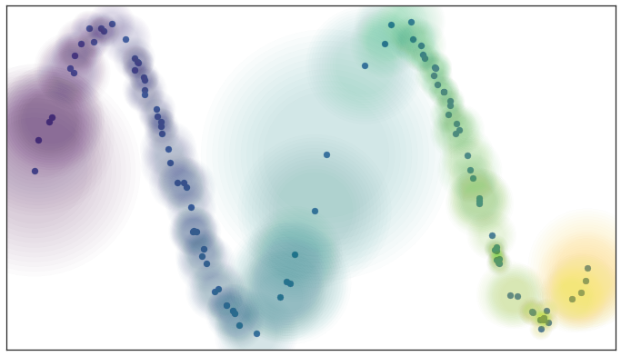L’objectif de Stochastic Neighbor Embedding (SNE, [HR02]) est de déterminer le nuage de points représenté par les observations réduites \(\mathbf{y}_i\) de telle sorte que \(p(\mathbf{y}_j|\mathbf{y}_i) \simeq p(\mathbf{x}_j|\mathbf{x}_i)\) pour tous les couples \((i,j)\).