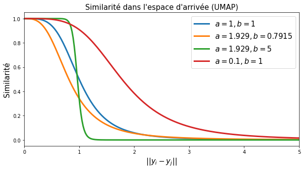 UMAP considère une famille de fonctions de similarité plus large, inspirée de la loi \(t\) de Student, pour l’espace réduit.