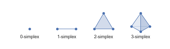 Considérons \(\mathcal{E} \in \mathbb{R}^k\) un ensemble de points dans un espace vectoriel de dimension \(k\). Un simplexe de dimension \(k\) est défini comme étant l’enveloppe convexe de \(k+1\) points \(\{\mathbf{v}_1, \mathbf{v}_2, \ldots, \mathbf{v}_{k+1}\} \subset \mathcal{E}\). Le simplexe est donc un objet multi-dimensionnel à \(k+1\) sommets pour \(k+1\) côtés (ou faces). Pour \(k=0\) nous obtenons un point, pour \(k=1\) un segment, pour \(k=2\) un triangle, pour \(k=3\) un tétraèdre et ainsi de suite.