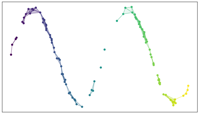 A l’aide du graphe, une représentation vectorielle « convenable » (du point de vue de la classification automatique !) des données est obtenue. Cette représentation peut être employée pour initialiser t-SNE ou UMAP.