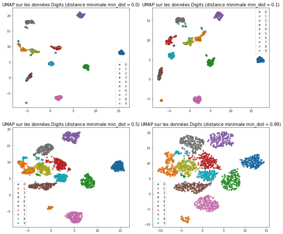 Fig. 120 Variation des résultats obtenus avec UMAP pour différentes valeurs de min_dist (avec n_neighbours = 5)¶