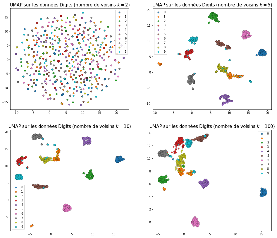 Fig. 119 Variation des résultats obtenus avec UMAP pour différentes valeurs de n_neighbours (avec min_dist = 0,1)¶