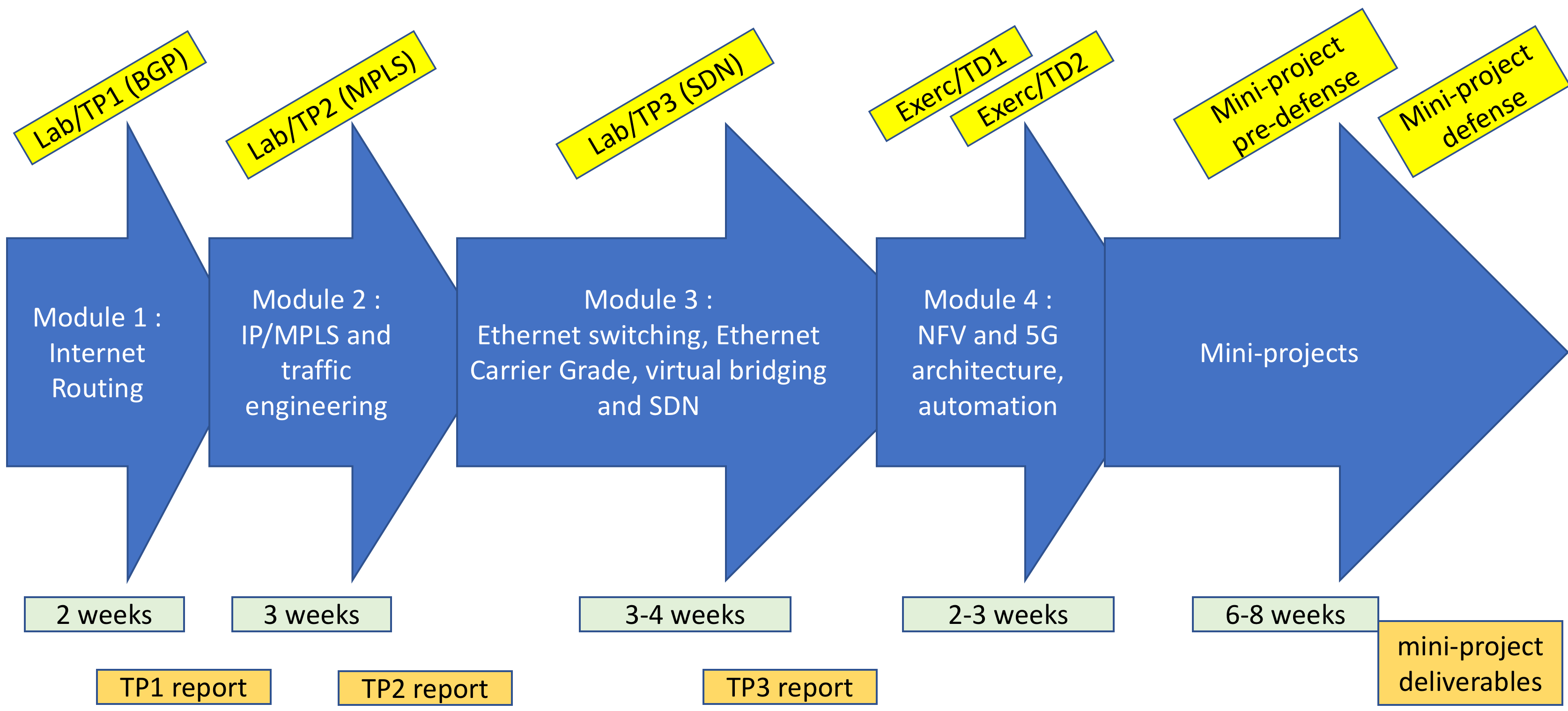 The following scheme illustrates the course planning, milestones and deliverables.